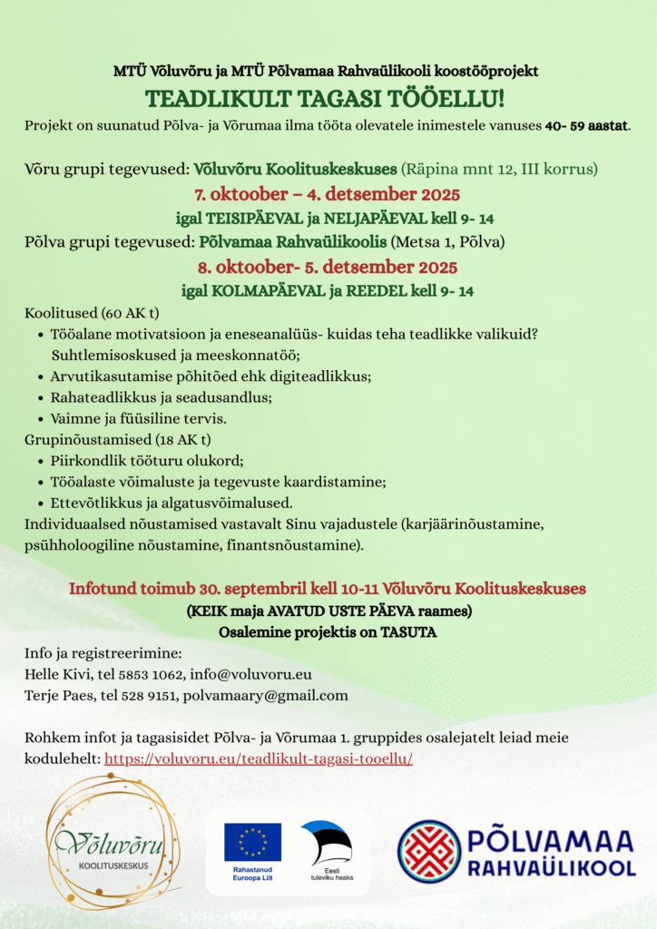 MTÜ Võluvõru ja MTÜ Põlvamaa Rahvaülikool viivad ellu koostööprojekti „Teadlikult tagasi tööellu!. Projekti tegevused toimuvad kahes maakonnas- Põlva- ja Võrumaal ning on suunatud 40.- 59. aastaste ilma tööta olevatele inimestele. Eesmärk on läbi erinevate tegevuste aidata kaasa teadlikule tööle rakendumisele ja seal püsimisele, konkurentsivõime tõstmisele ja seeläbi parandada tööle saamise võimalusi.